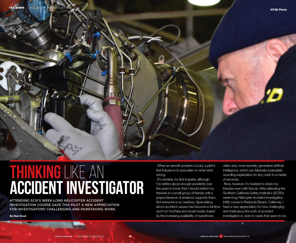 • Thinking Like an Accident Investigator – What we learned from SCSI’s week-long helicopter accident investigation course.